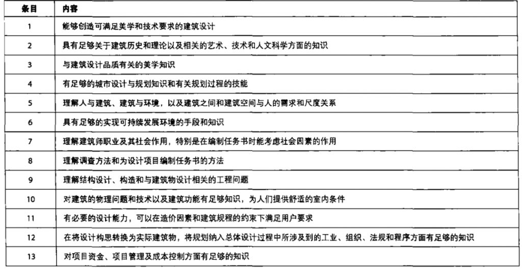 在国际建协与1996年通过的《UIA建筑实践的职业主义推荐国际标准认同书》中明确了建筑师应具有的13个方面的基本知识和技能(表1)。