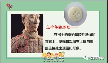 首先,老师展示秦始皇陵兵马俑的出土图片,让学生观察兵马俑的衣着,当学生发现将军俑右上肩与胸部连接处出现纽扣形象时,他们都很惊讶,没想到人类对纽扣的使用已经有上千年的历史,立即对纽扣引起兴趣。
