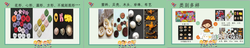 【设计意图】老师通过生活中常见的纽扣图片的欣赏,让学生产生了要接触纽扣的念头,激发学生对劳动主题的探究兴趣,是一种有效的教学手段。