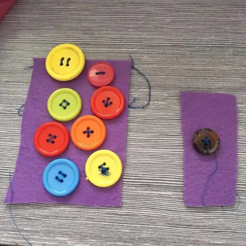 这次活动的具体目标是让学生注意留心观察和动手实践,在观察中发现问题,提出问题;学习使用针线缝制纽扣,尝试利用纽扣学习在不织布上构图装饰;学会倾听,学会合作,善于接受别人好的建议,不断完善自我;学会总结,学会交流。从活动的过程和结果来看,这些目标都得到了实现。
