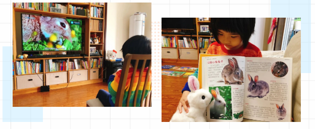 本次陪伴孩子进行项目的过程中,我将这充实的三天与之前的陪伴进行对比,发现两者之间是有区别的:这三天每天有一起商量好的要做的活动(如看兔子绘本或配音兔子作品),有目标有动力还很开心,之前没有什么目标的时候往往会选择随便看看书,或直接看动画片、玩游戏。这也让我反思,以后如何在生活中找到更多有趣的点,和孩子一起,名为玩耍与探究,实则陪伴与互动,做有趣的事,成长为有趣的人,过有趣的人生。