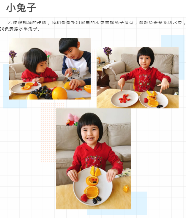 1. 观看摆水果的视频让我更了解了兔子的形状,在妈妈的帮助下,我还把英文视频配音为中文版本,和我的好朋友们分享。