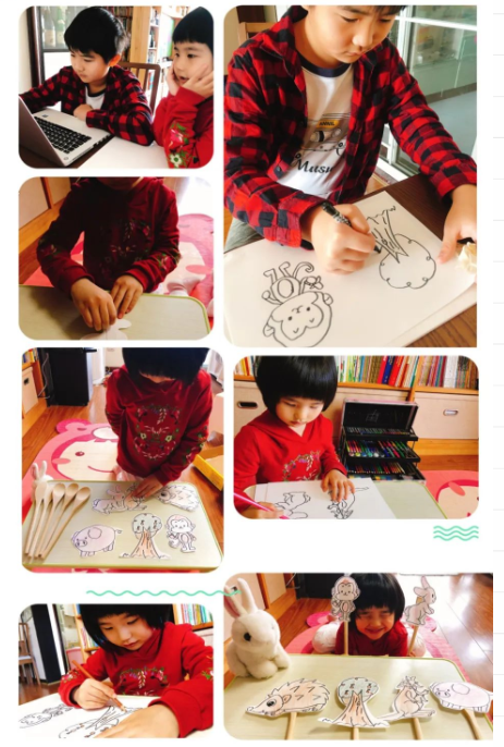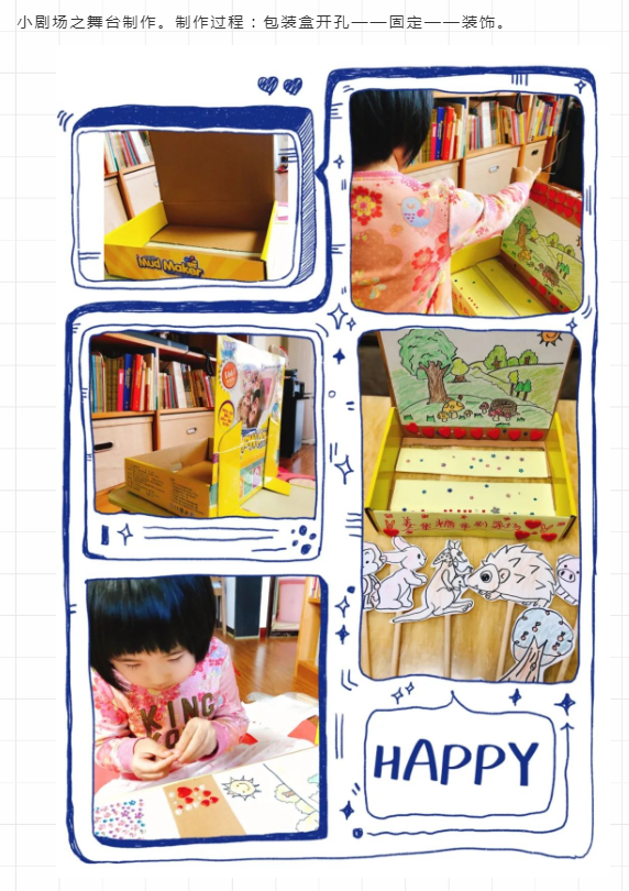 3.接着是为我的故事剧场做准备:我想出了故事里的小动物,哥哥帮我画出了小动物,我给小动物们涂上了颜色,最后,我和妈妈一起用彩泥的包装盒子制作出了舞台。